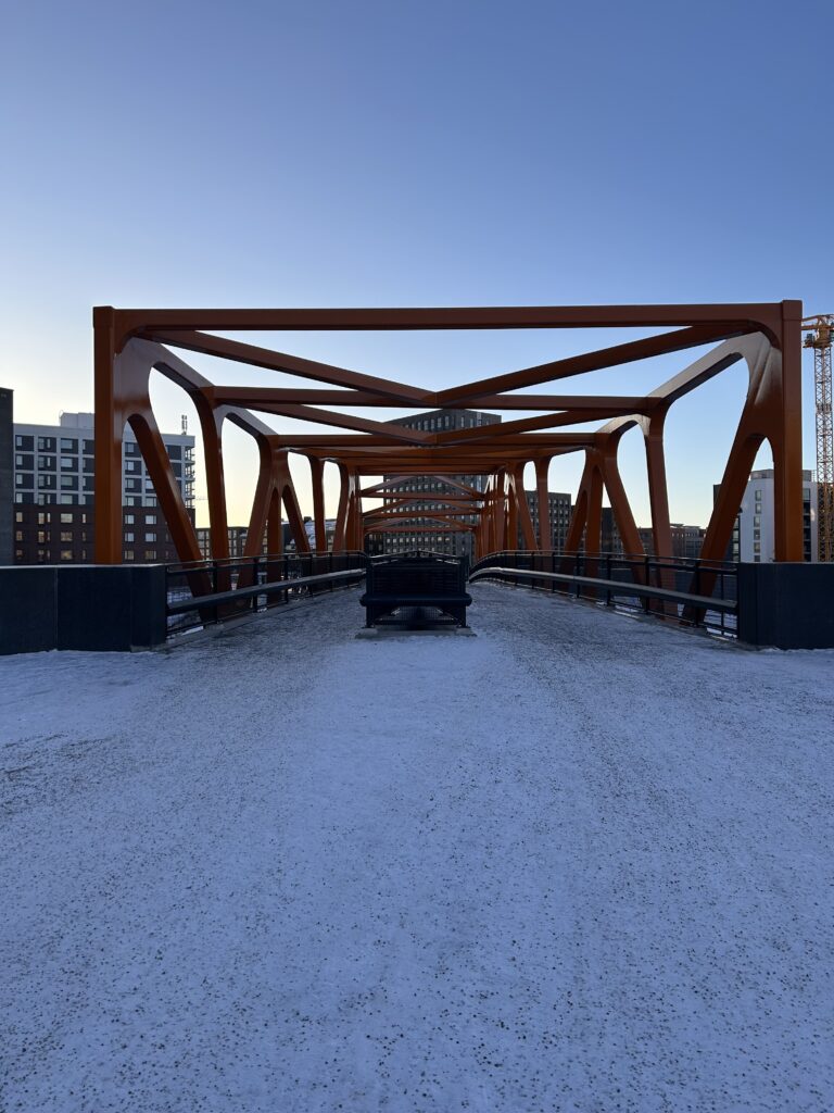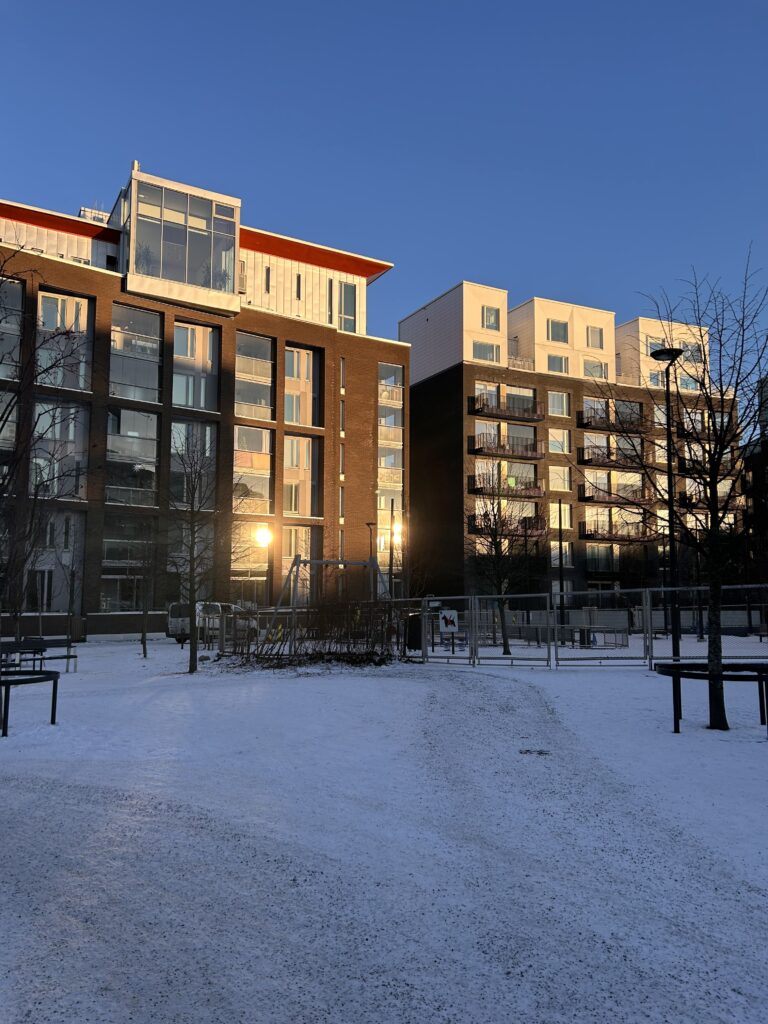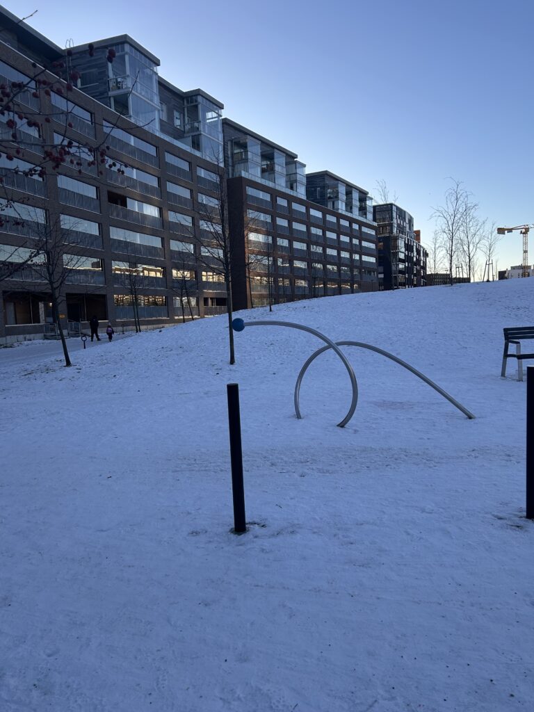 You can get to Jätkäsaari by tram 9, the metro or a few different buses. However, since I live in Punavuori, I could either walk 15 minutes but I decided to take a taxi due to the snow and ice. I started my trip at The Park of Good Hope. Even if it was the middle of winter, there were still people walking about in the park, people taking their kids to the park and walking their dogs or criss-crossing the park to get home. It’s actually a nice park with a lot of entrances and exits. I enjoyed the views and the modern architecture. This neighborhood reminds me a little bit of a concrete jungle, a little similar to Shanghai, just smaller buildings.